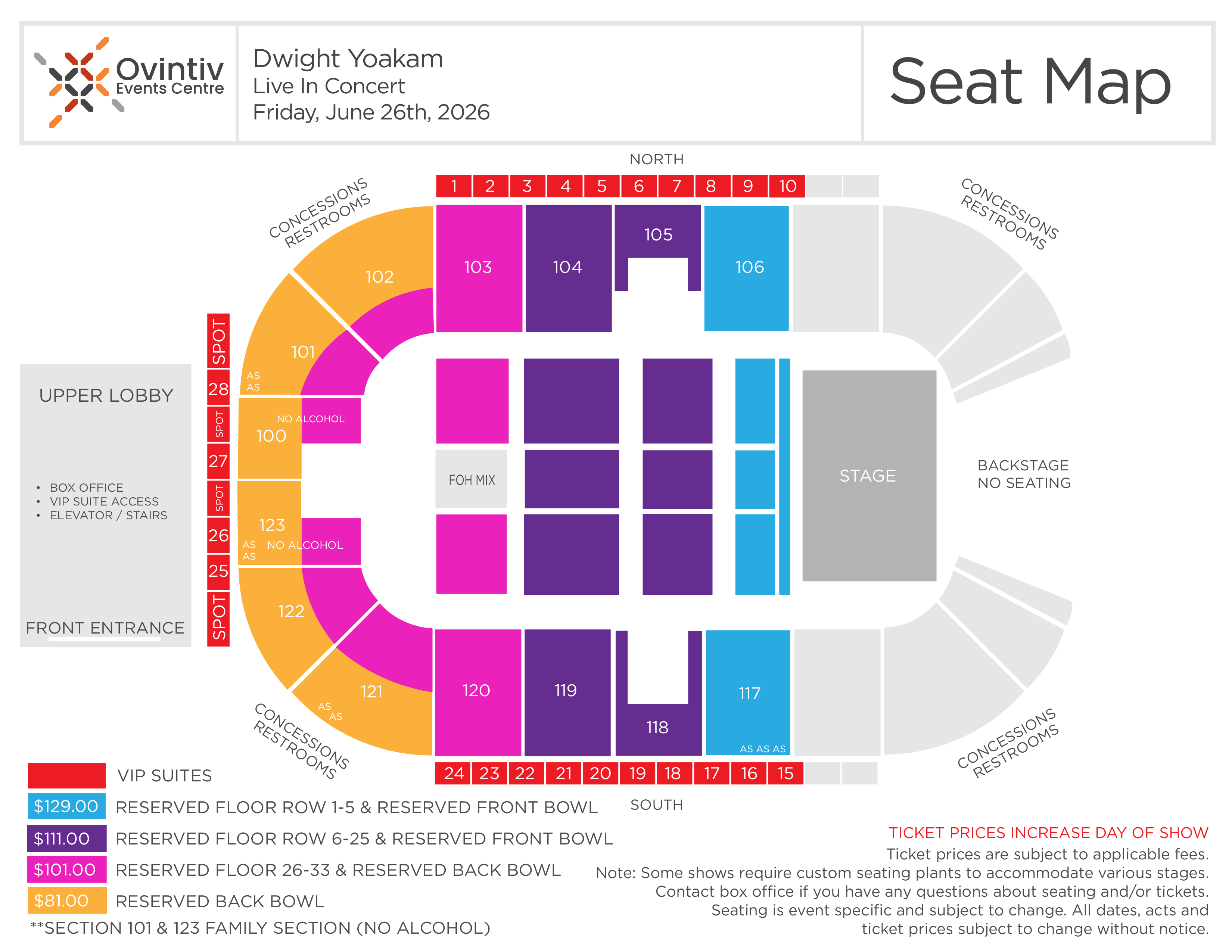 Ticket PricesReserved Floor Row 1-5 & Reserved Front Bowl $129.00, Reserved Floor Row 6-25 & Reserved Mid Front Bowl $111.00, Reserved Floor Row 26-33 & Reserved Back Bowl $101.00, Reserved Top Back Bowl (Sec 100 & 123 Family Section - No Alcohol) $81.00